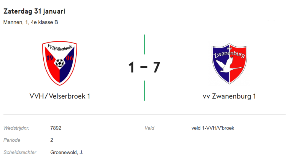 In de veertigste minuut kreeg Zwanenburg een vrije trap op de rand van het strafschopgebied aan de rechterzijde, deze werd genomen door Wouter en kwam tegen de aanvoerder van VVH aan. De aanvoerder van Zwanenburg was hier als de kippen bij en schoot het vierde doelpunt van de middag binnen. 0 – 4. Vlak voor rust was het weer tijd voor een vleugje onsportiviteit. De linkerverdediger van VVH was mee naar voren gekomen en kreeg de kolder in zijn kop. Na een duel, die hij verloor, met Camiel Kesbeke had hij de behoefte om maar even door te trappen op Camiel. De scheidsrechter had deze niet gezien anders had VVH met tien man de rust ingegaan.