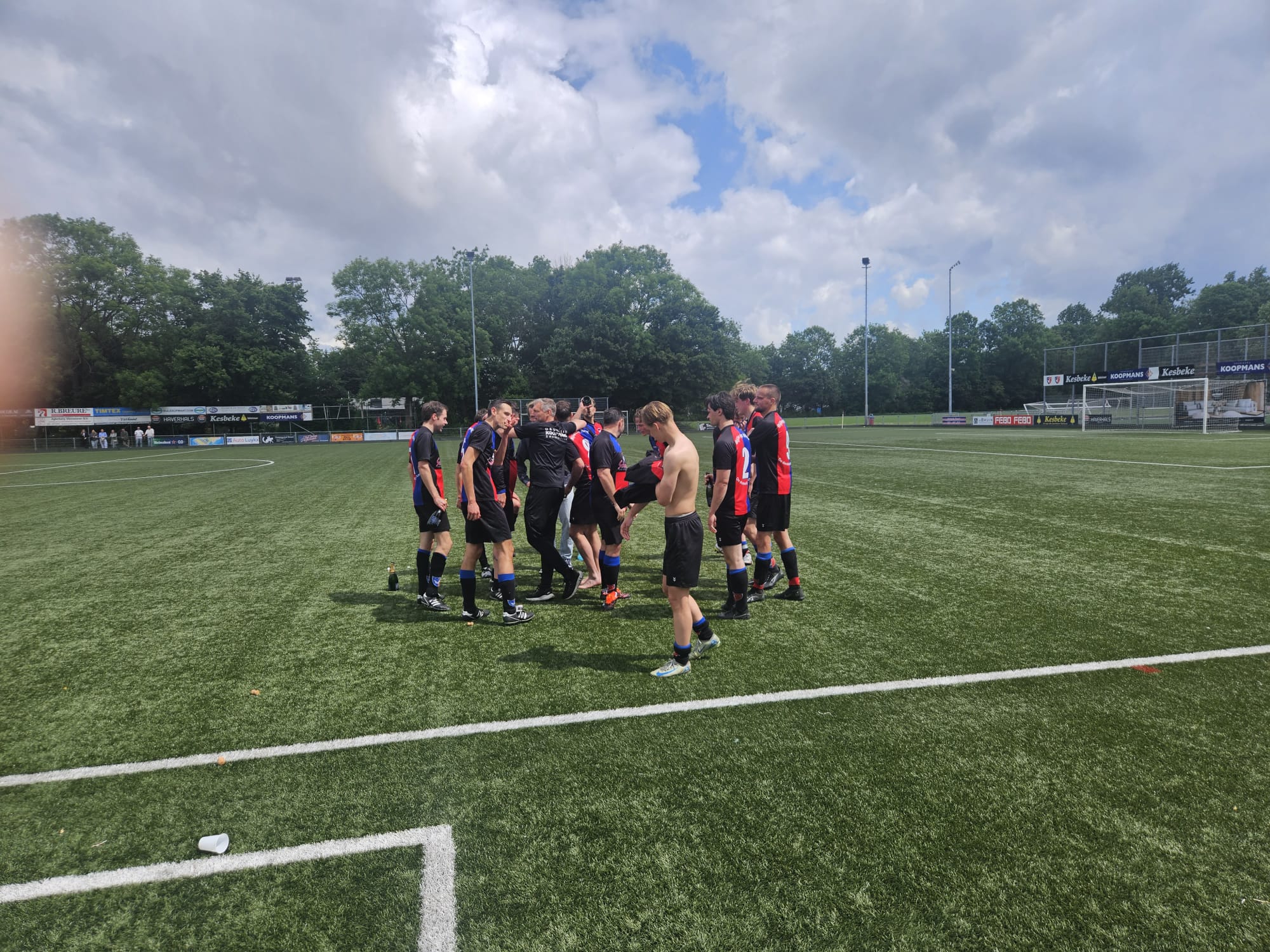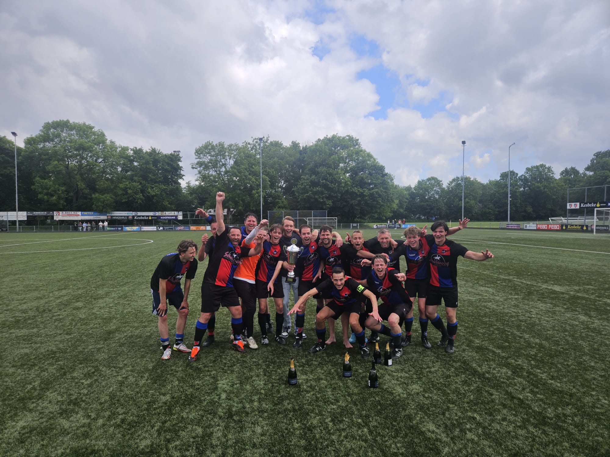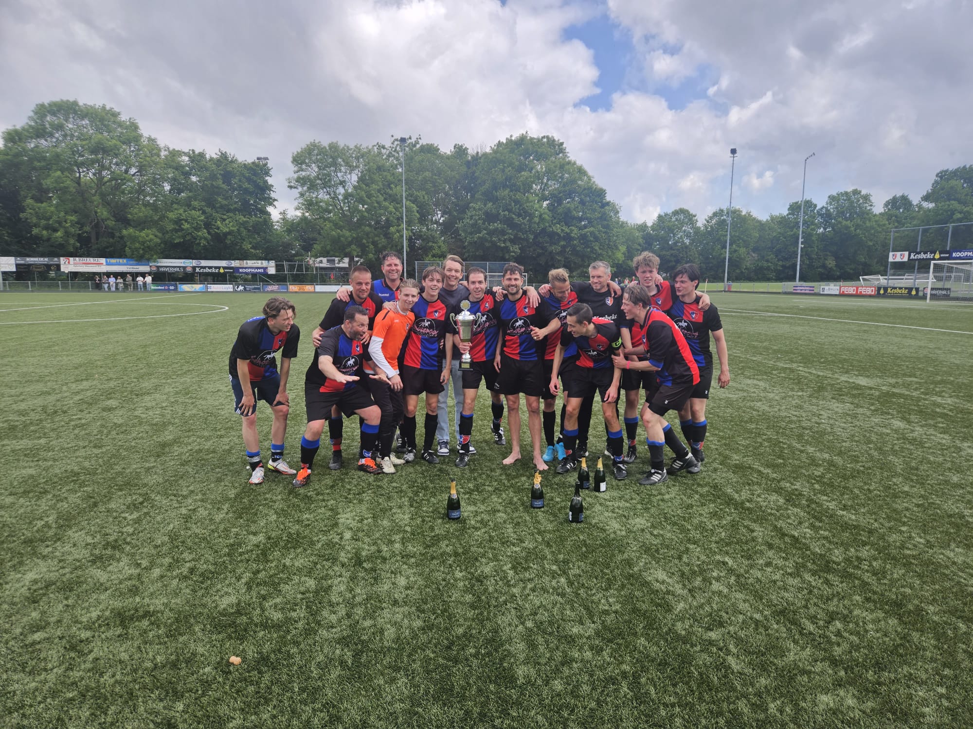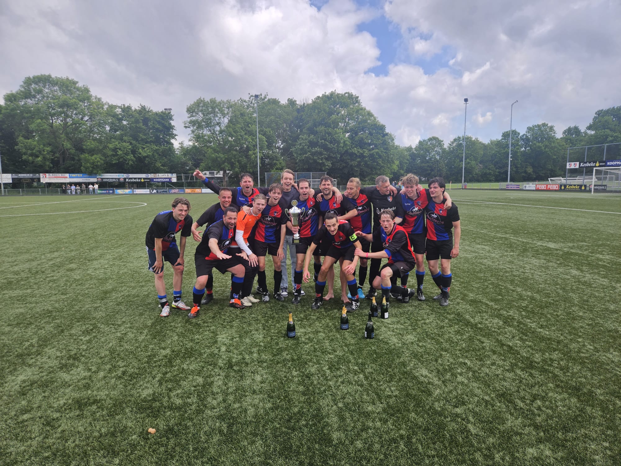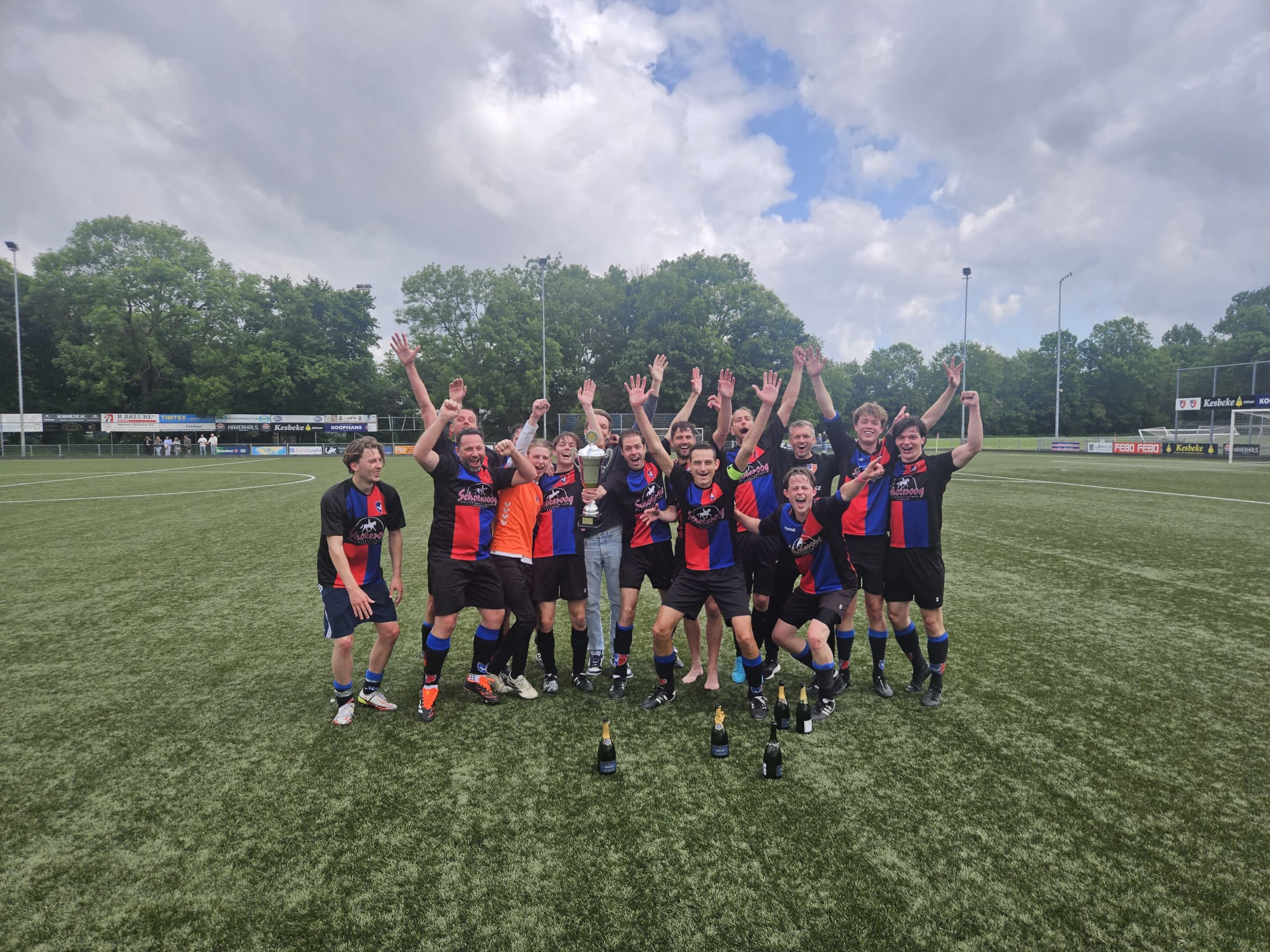 Wat onze zaterdag 1 gisteren niet lukte, wist onze zondag 2 vandaag wel voor elkaar te krijgen. Met nog 5 wedstrijden te gaan KAMPIOEN worden.  Tegenstander Arsenal 10 wist precies 11 man op te trommelen en die druppelden één voor één binnen waardoor de wedstrijd wat later begon.  Het tweede stond vol geconcentreerd aan de start en vrijwel meteen na de aftrap was het al raak. De honger naar meer zorgde er voor dat er na iets meer dan een half uur al 6 – 0 op ons fraaie scorebord stond. Toen vond Arsenal het welletjes en strafte een fout in de verdediging meteen af: 6 – 1. Zouden we nog een wedstrijd krijgen? Het 2e schrok wel even maar wist de score voor rust toch nog naar 7 – 1 te brengen. In de tweede helft wist het tweede de score nog verder op te voeren maar deed Arsenal zo af en toe ook nog wat terug. Na het verlossende eindsignaal bleek dat de toeschouwers getuige waren geweest van een doelpuntrijke wedstrijd: 13 – 5.