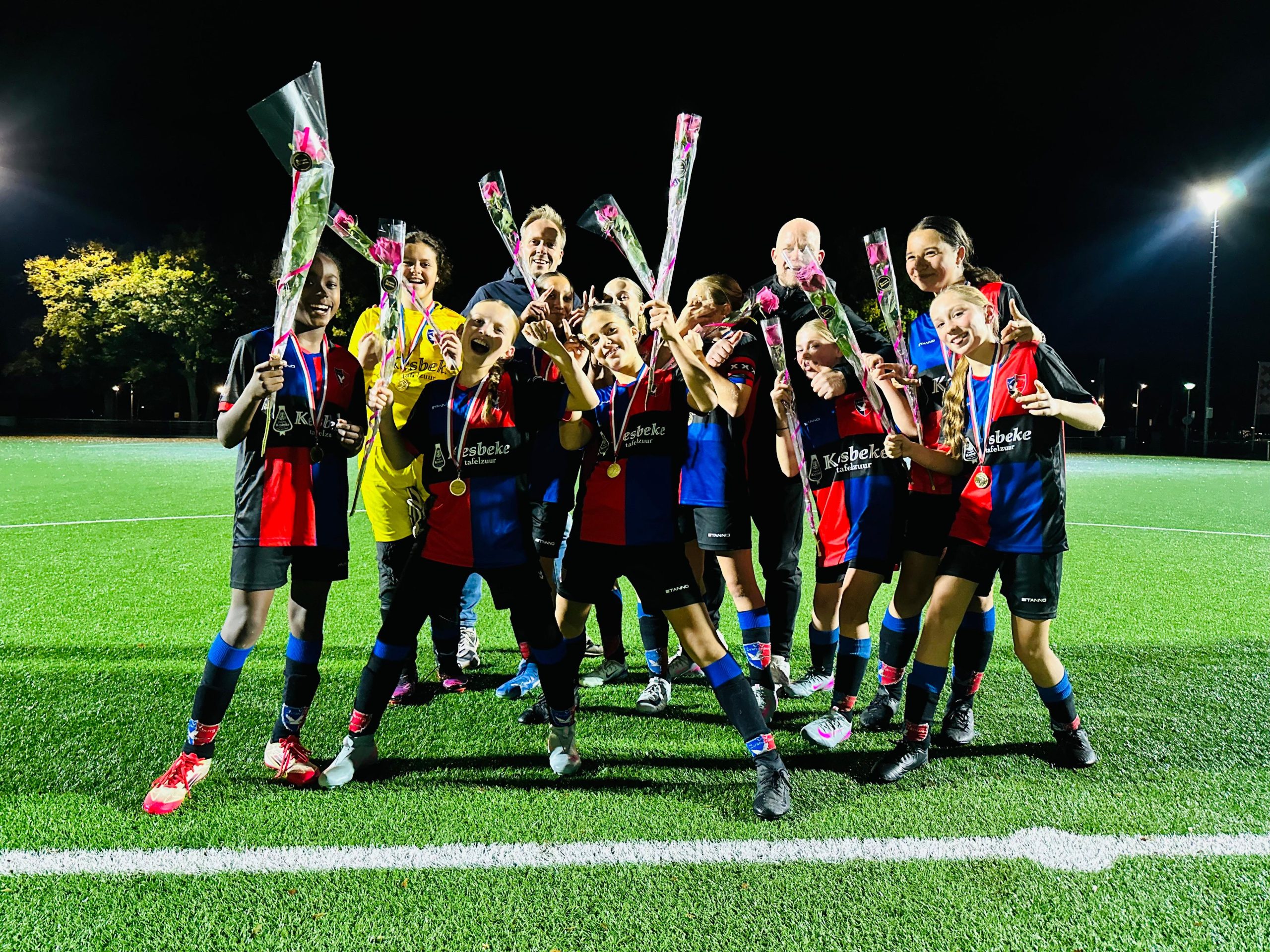 De meiden van de MO15-1 (vorig jaar MO12-1) zijn ook dit seizoen gelijk in de eerste fase kampioen geworden. In de derde klasse bleven ze ongeslagen en kregen slechts 2 doelpunten tegen. Al op 27 september was het kampioenschap binnen, maar er stond nog een inhaalwedstrijd tegen DCG op de planning. Deze werd woensdagavond ook met 5-0 gewonnen. Met een doelsaldo van +45 stromen de meiden na de herfstvakantie door naar de tweede klasse. Super gedaan meiden!!!