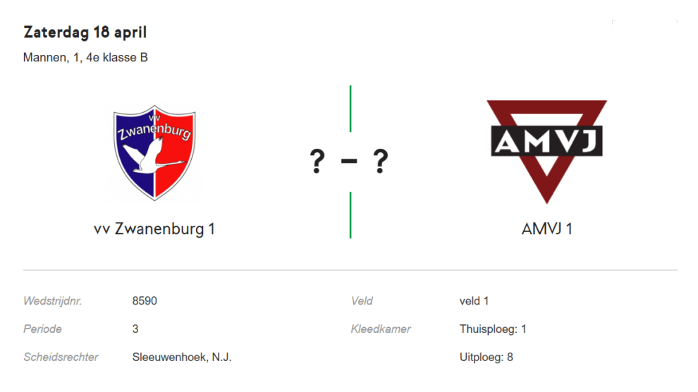 Om (iets na) drie uur werd er afgetrapt door de tegenstander van vandaag, AMVJ. Zwanenburg begon beheerst en volwassen de wedstrijd door de bal direct geduldig rond te laten gaan. AMVJ werd direct naar achteren gedrukt en stond na twee minuten spelen al met negen veldspelers en één doelman te verdedigen. In de vijfde minuut leek Zwanenburg al direct op voorsprong te komen door Luca van Dijken. Luca kreeg de bal volgens de scheidsrechter die dertig meter achter de actie “liep” in buitenspelpositie aangespeeld en gaf het sein voor buitenspel. Terwijl de grensrechter zijn vlag niet omhoog gooide. Maar na fluiten van de scheids pas zijn vlag gebruikte.