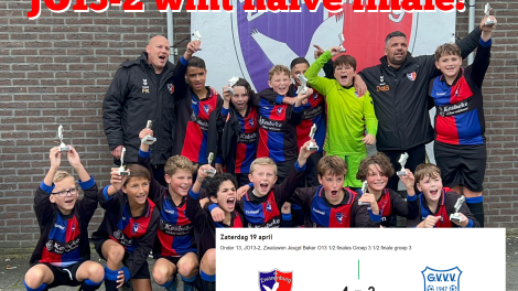 Op zaterdag 19 april speelt ons JO13-2 team de halve finale in de bekerstrijd tegen G.V.V.V. Wij zouden het leuk vinden als er zo veel mogelijk supporters komen kijken...