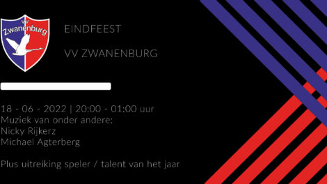 Op 18 juni vindt het Eindfeest van vv Zwanenburg plaats. Het evenement start om 20.00u en duurt tot 01.00u. Tijdens het feest is er live muziek van onder andere Michael...