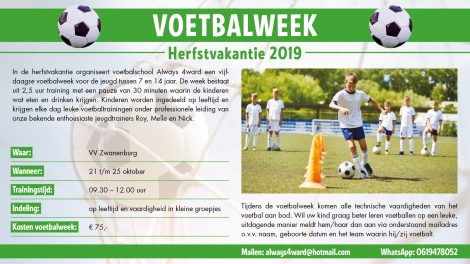 Buiten is het herfst en volgende maand is het al weer herfstvakantie. Tijdens deze vakantie organiseert voetbalschool Always 4ward een vijfdaagse voetbalweek voor de...