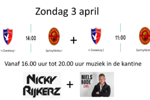 Zondag 3 april spelen vv Zwanenburg 1 & 2 allebei thuis tegen Sporting Martinus. vv Zwanenburg 2 speelt om 11:00 en vv Zwanenburg 1 speelt aansluitend om...